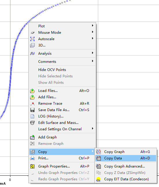 如下圖,在曲線上單擊鼠標(biāo)右鍵,選擇Copy,然后可以選擇Copy Data,可以把軟件中測(cè)得的數(shù)據(jù)直接復(fù)制,然后粘貼到txt或者Excel等文件中,甚至可以直接粘貼到Origin等繪圖軟件中。