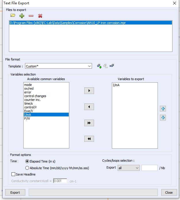 最后點(diǎn)擊最下方的輸出,txt文件就保存在與原始EC-Lab文件相同的文件夾中。