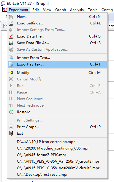 如下圖,打開(kāi)原始的EC-Lab數(shù)據(jù)文件后,在Experiment下,選擇Export as Text…,可以將數(shù)據(jù)直接導(dǎo)出為txt格式。
