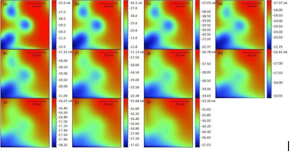 一旦選定合適的孔,在不同高度對其進行面掃描。所有面掃描均在50x50μm2的面積上進行,X和Y的步長為1μm,運行時間約為11.5分鐘。使用SECM150定序選項(在New Experiment菜單中提供)進行掃描。在進行每個面掃描后,探針在Z中自動向上移動相對于其最后位置1μm。這是作為一個自動回路形成的,共有11個操作,如圖4所示。