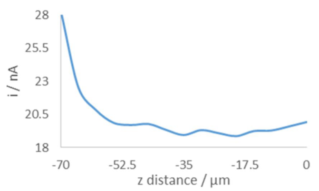 圖4為樣品上最大的石墨薄片上的逼近曲線,可以看出其為正反饋,說(shuō)明樣品為導(dǎo)體。可以通過(guò)SECM測(cè)試薄片和基體Si/SiO2的差異。