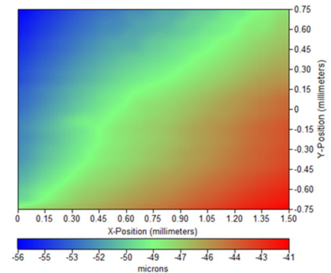 圖5為原始形貌圖和差值處理后的形貌圖??梢钥闯鰳悠吩?.5mm范圍內(nèi)傾斜約15?m。SECM中探針到樣品的距離直接與導(dǎo)體上測(cè)試的電流成正比,與絕緣體上測(cè)得的電流成反比。如果不校正傾斜,電流測(cè)量會(huì)受影響。雖然這種影響可以在測(cè)量結(jié)束后通過(guò)掃描電化學(xué)工作站M470軟件的“Tilt Correction”進(jìn)行校正,但是這對(duì)于探針到樣品距離改變引起的相反的變化是無(wú)效的。
