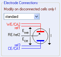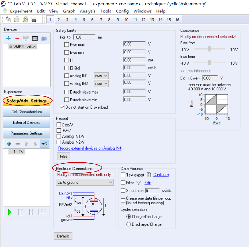 EC-Lab軟件中,添加實驗后,在左側Safety/Adv. Settings下有一個Electrode Connections部分,其中可以選擇standard、CE to ground或者其他大電流儀器的連接方式(如下圖)。