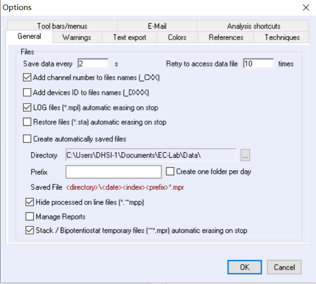臨時(shí)文本文件,包含實(shí)驗(yàn)條件:儀器IP號(hào)、通道號(hào)、用戶名、文件名及其位置、實(shí)驗(yàn)開(kāi)始時(shí)的參數(shù)設(shè)置和電解池特性。用戶可以使用“配置選項(xiàng)”菜單選擇保留此文件。