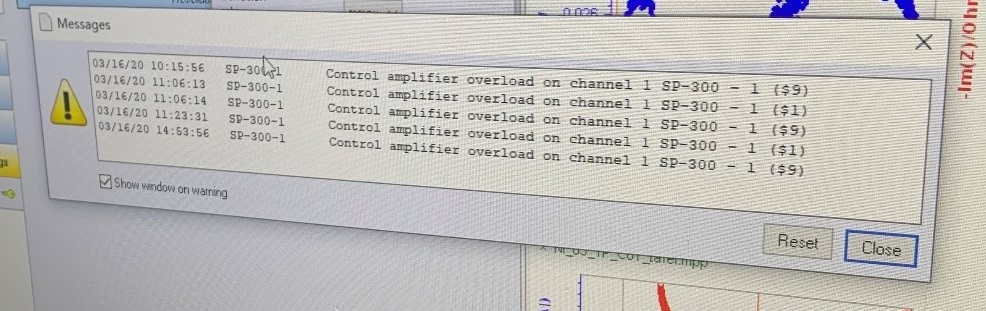 EC-Lab軟件檢測(cè)到Ewe、Eoc或者I過載時(shí),都會(huì)彈出報(bào)錯(cuò)信息。下圖就是一個(gè)提示過載的信息。本文主要介紹過載的兩種情況。