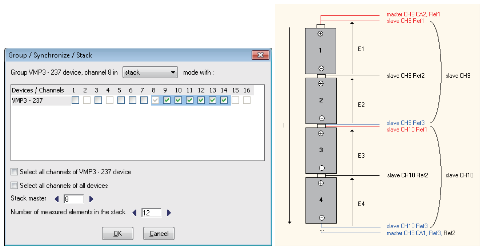 如果用戶需要進(jìn)行STACK模組的交流阻抗譜測(cè)試,僅主通道需要配置EIS交流阻抗功能模塊。如VMP3使用16通道,僅1個(gè)通道配置交流阻抗功能模塊時(shí),即能測(cè)量多達(dá)30個(gè)元件串聯(lián)的模組(假設(shè)整個(gè)模組電位小于20V時(shí))。