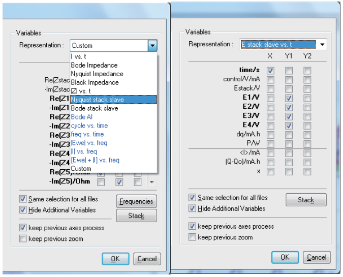 STACK模組實(shí)驗(yàn)可以通過下圖“Slave”選項(xiàng)令從通道數(shù)據(jù)點(diǎn)全部疊加顯示于同一個(gè)曲線圖。對(duì)于EIS交流阻抗譜測(cè)試,整個(gè)模組及各個(gè)元件的Nyquist及Bode圖均可以顯示。