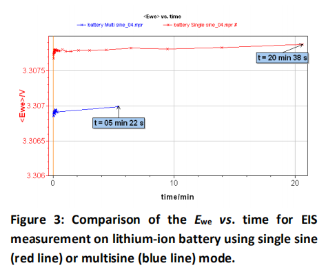 圖Figure.3為鋰離子電池交流阻抗譜圖single sine及multisine測量模式的實驗時間對比。Single sine用時20分38秒,multisine模式則僅用時5分22秒。Multisine測量模式可以明顯的看出比single sine模式快約4倍。Multisine eis測量模式測試非常快速,能大大節(jié)省實驗時間,是一個避免某些電化學(xué)系統(tǒng)隨時間變化漂移的交流阻抗測量好方法。