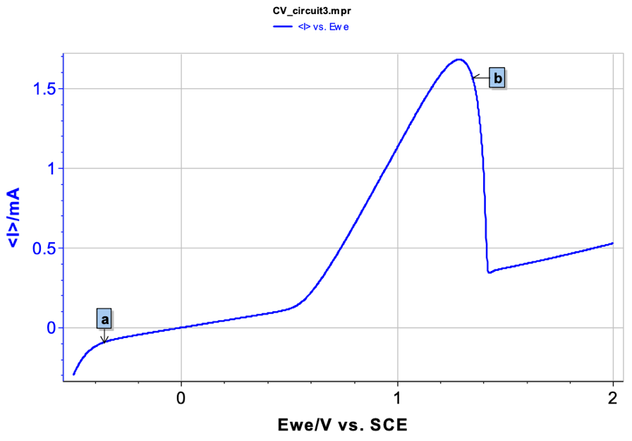 圖6是采用PEIS技術測試Bio-Logic測試盒Test-box 3 在圖1中b點(即在電位控制(PC)下)的Nyquist阻抗圖。圖6所示的Nyquist阻抗圖仍然由兩個電容弧組成,根據鐘形穩(wěn)態(tài)曲線,兩個電容弧在頻率上分離開,低頻時阻抗的實部為負值。
