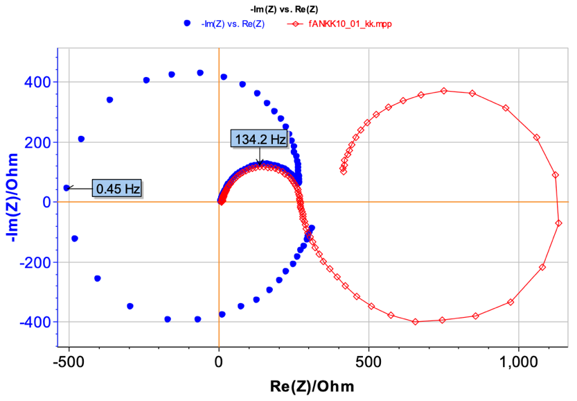 圖11: 使用PEIS技術在H2SO4介質中獲得的鎳電極Nyquist圖(EWE = 0.9 V, Va = 12.5 mV, fmin = 50 mHz, fmax = 10 kHz(藍線))以及K-K轉換獲得的Nyquist圖(紅線)