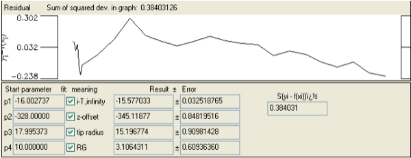 現(xiàn)在,χ2≈0.384,達到預期。雖然點數(shù)減少了,但是擬合結果更好了。tip radius的值降低,更接近實驗值,12.5 ?m。Rg值從1.13升高到3.11,這是一個更合理的值。
