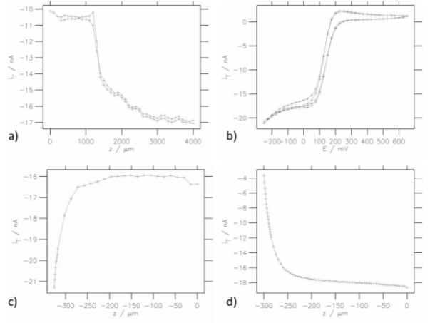 所有技術的面掃描數(shù)據(jù)都與MIRA兼容,包括ic-SECM和ac-SECM獲得的不同數(shù)據(jù)、dc-SECM和ac-SECM獲得的逼近曲線、以及循環(huán)伏安曲線。