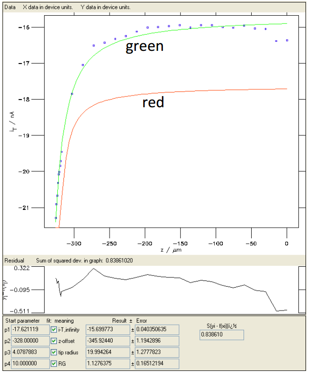 圖10 “SECM conductor w/o i_offset (Lefrou)”獲得的結果。紅色曲線是用Start參數(shù)獲得的,綠色曲線是擬合后獲得的。