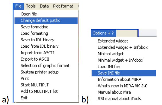 打開MIRA軟件,彈出如圖2的窗口,.ini文件可用。.ini文件定義了默認打開文件夾、默認輸出文件夾以及默認表現(xiàn)形式。默認路徑可以更改,如圖3所示。這些更改可以保存在新的.ini文件中,如圖3b所示。