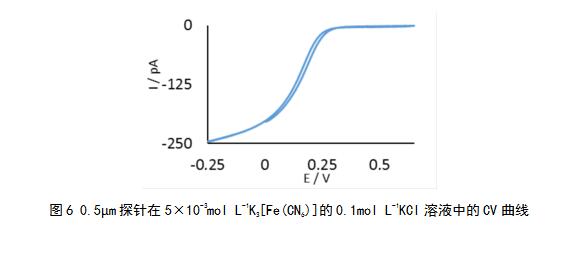 與直徑≥10?m的毛細(xì)管探針不同,直徑≤5?m的探針不能進(jìn)行機(jī)械拋光。這種直徑較小的探針機(jī)械拋光過(guò)程中很容易破壞探針尖端。而且,直徑較小的探針是由鉑絲拉成的,探針尖端是逐漸變細(xì)的,機(jī)械拋光會(huì)改變探針直徑和RG值。然而可以通過(guò)電化學(xué)方法原位清潔探針。本文的實(shí)驗(yàn)中,可以通過(guò)動(dòng)電位極化,在-1.5V~1.25Vvs.SCE快速掃描的方法來(lái)清潔探針,重復(fù)多次,直到探針回到開(kāi)路電位。根據(jù)CV結(jié)果來(lái)選擇電位區(qū)間。PC1測(cè)試采用的0.5?m探針在5×10-3mol L-1K3[Fe(CN6)]的0.1mol L-1KCl溶液中的CV曲線如圖6所示。注意,溶液中溶解氧的存在使得CV的基線接近-0.25V,擴(kuò)散不平衡。探針尺寸不同,確切數(shù)值也不同,與本實(shí)驗(yàn)一致的氧化還原介質(zhì)濃度和探針,清潔后,測(cè)試結(jié)果基本形狀應(yīng)與圖6一致。