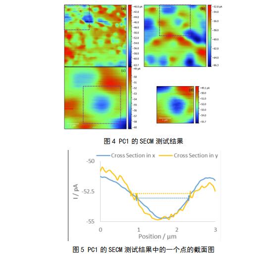用戶可以采用SECM150結(jié)合微米尺寸探針測(cè)試微米尺寸的特性。本文測(cè)試了兩種不同的聚碳酸酯薄膜。通過(guò)先測(cè)試較大區(qū)域,然后可以選擇單個(gè)區(qū)域集中測(cè)試,也可以提高分辨率。最后介紹了幾種實(shí)驗(yàn)操作的技巧。
