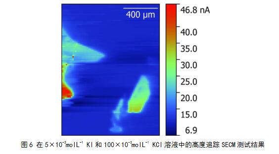 SECM測(cè)試溶液為5×10-3molL-1 KI和100×10-3molL-1 KCl溶液。探針直徑15?m,偏置電壓0.6VvsSCE,步長(zhǎng)15?m。測(cè)試前,給探針施加0.6VvsSCE電壓,直到電流穩(wěn)定。