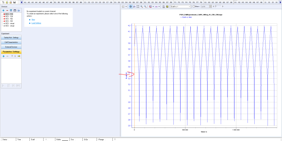 EC-Lab和BT-Lab軟件的另一個特點是當(dāng)關(guān)閉實驗窗口后,不影響數(shù)據(jù)采集的進行。所以,當(dāng)發(fā)生軟件卡頓時,可以暫時關(guān)閉實驗窗口(如下圖所示)。此時由于軟件不需要實時顯示數(shù)據(jù),也會相應(yīng)的減少卡頓。同樣的,當(dāng)需要顯示頁面時,只需要簡單的雙擊軟件頁面上方的實驗通道序號,即可恢復(fù)原來的顯示。