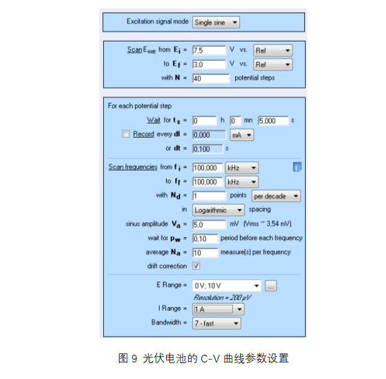 對(duì)于光伏電池特性,電壓在3-7.5 V之間掃描,信號(hào)頻率為100 kHz(圖9)。根據(jù)以前的研究,考慮了R/C模型。所以繪制了Cp vs V曲線(圖10)。