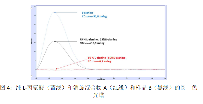 樣品C的最大圓二色光譜信號為28.1 mdeg。該圓二色光譜對應(yīng)于94.2%的L-丙氨酸和5.8%的D-丙氨酸的混合物。