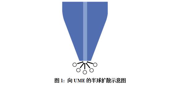 SECM的UME探針是該技術(shù)的關(guān)鍵工作原理。在SECM中,通常使用25微米或更小的直徑。當使用UME時,會發(fā)生半球向電極的擴散,如圖1所示,并且探針在電解質(zhì)中測得的穩(wěn)態(tài)電流由氧化還原物質(zhì)向UME探針的擴散確定。這意味著測得的穩(wěn)態(tài)法拉第電流由下式給出: