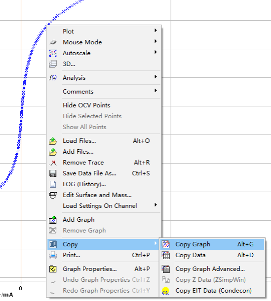如下圖,在曲線上單擊鼠標(biāo)右鍵,選擇Copy,然后可以選擇Copy Data,可以把軟件中測(cè)得的數(shù)據(jù)直接復(fù)制,然后粘貼到txt或者Excel等文件中,甚至可以直接粘貼到Origin等繪圖軟件中。