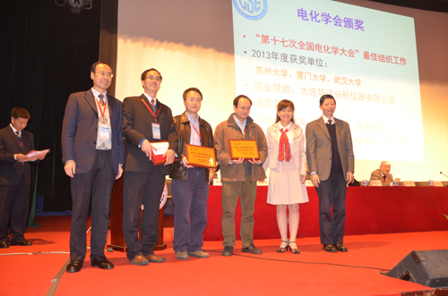華洋科儀冠名的參會組織獎由廈門大學(xué)、蘇州大學(xué)和武漢大學(xué)獲得,中國化學(xué)會電化學(xué)委員會主任萬立駿院士,蘇州大學(xué)校長朱秀林先生和華洋科儀董事長齊愛華女士分別為獲獎單位頒發(fā)了獎牌和證書。
