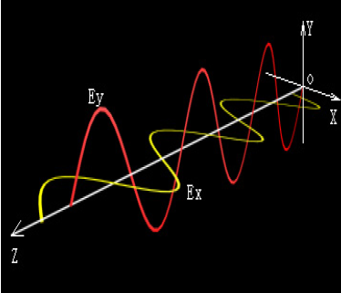 2、圓偏振光:對著光前進的方向觀察時,一束光波的電場矢量(或磁場矢量)端點在空間的軌跡是以光傳播方向為軸的圓形螺旋(在平面上的投影為圓形)。電矢量方向沿逆時針方向旋轉(zhuǎn),稱為左圓偏振光;電矢量方向沿順時針方向旋轉(zhuǎn),稱為右圓偏振光。