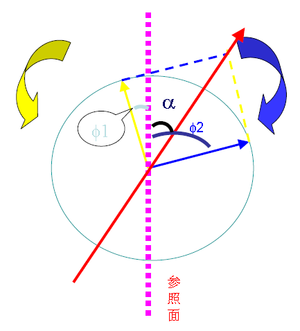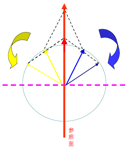 振幅相等、位相差1/4波長,兩束線偏振光合成圓偏振光