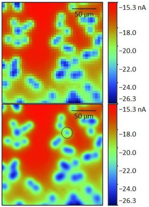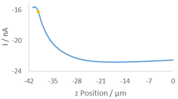 為了確定面掃描的Z位置,在探針上施加-0.65V的偏置,進行逼近曲線,如圖3所示。曲線末端的扭結(jié)(在-42μm處)表示探針已經(jīng)接觸到膜,因此選用圖中金色點標(biāo)記的位置作為Z位置。采用大面積低分辨率掃描,快速評估膜表面,確定最佳聚焦孔。理想情況下,孔隙應(yīng)與其他孔隙分開,并與周圍區(qū)域形成高對比度。在此基礎(chǔ)上,選擇以(130μm,144μm)為中心的孔。對孔中心進行一條逼近曲線,并調(diào)整Z位置,以解釋該位置的任何高度變化。新的Z值是之后所有測量的Z=0μm點。
