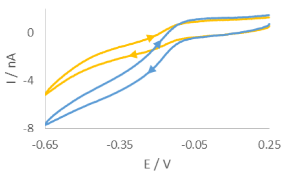 測試前,先進行UME的循環(huán)伏安測試(CV),掃描速率為0.1V s-1。CV測試結(jié)果如圖2所示。根據(jù)CV測試結(jié)果可以判斷在沒有試驗的情況下,[Fe(CN)6]3-是否能穿過薄膜自由擴散,以及后續(xù)實驗中預(yù)期電流的相對大小。在這些測量過程中,沒有采取任何措施去除溶解氧,因此,在曲線的基線上可以看到氧的影響。然而,與10分鐘之前運行的CV相比,可以看出,隨著更多的[Fe(CN)6]3-通過膜擴散,這種效應(yīng)減弱。兩個CV都遠離孔開口處,因此不能反映在UME尖端測得的最大電流,it。當(dāng)使用[Fe(CN)6]4-代替時,會使感興趣的反應(yīng)完全移出氧氣還原的電位區(qū)域,這種物質(zhì)被認為會導(dǎo)致更明顯和更快的電極污染,因此繼續(xù)使用[Fe(CN)6]3-。