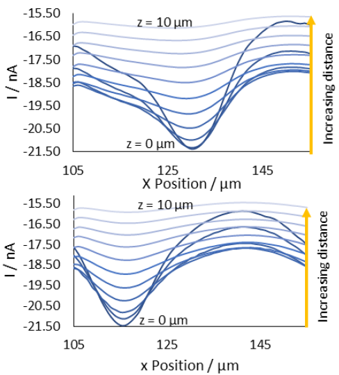 通過觀察兩個孔的X橫截面,可以進一步分析探針與樣品的距離增加對膜測量的影響,如圖8所示。在這兩種情況下,增加探針與樣品的距離會導(dǎo)致在孔上測量的電流減小,并增加在孔上測量的峰值半高寬。圖7顯示,當(dāng)探針在接近孔的位置移動較小的距離時,比在遠離孔的位置移動同樣的距離,產(chǎn)生的濃度變化更大。此外,探針與樣品的分離越小,最大濃度越大。這導(dǎo)致在小的探針樣品距離處出現(xiàn)高而尖的電流峰值,在大的探針樣品距離處出現(xiàn)短而寬的電流峰值。