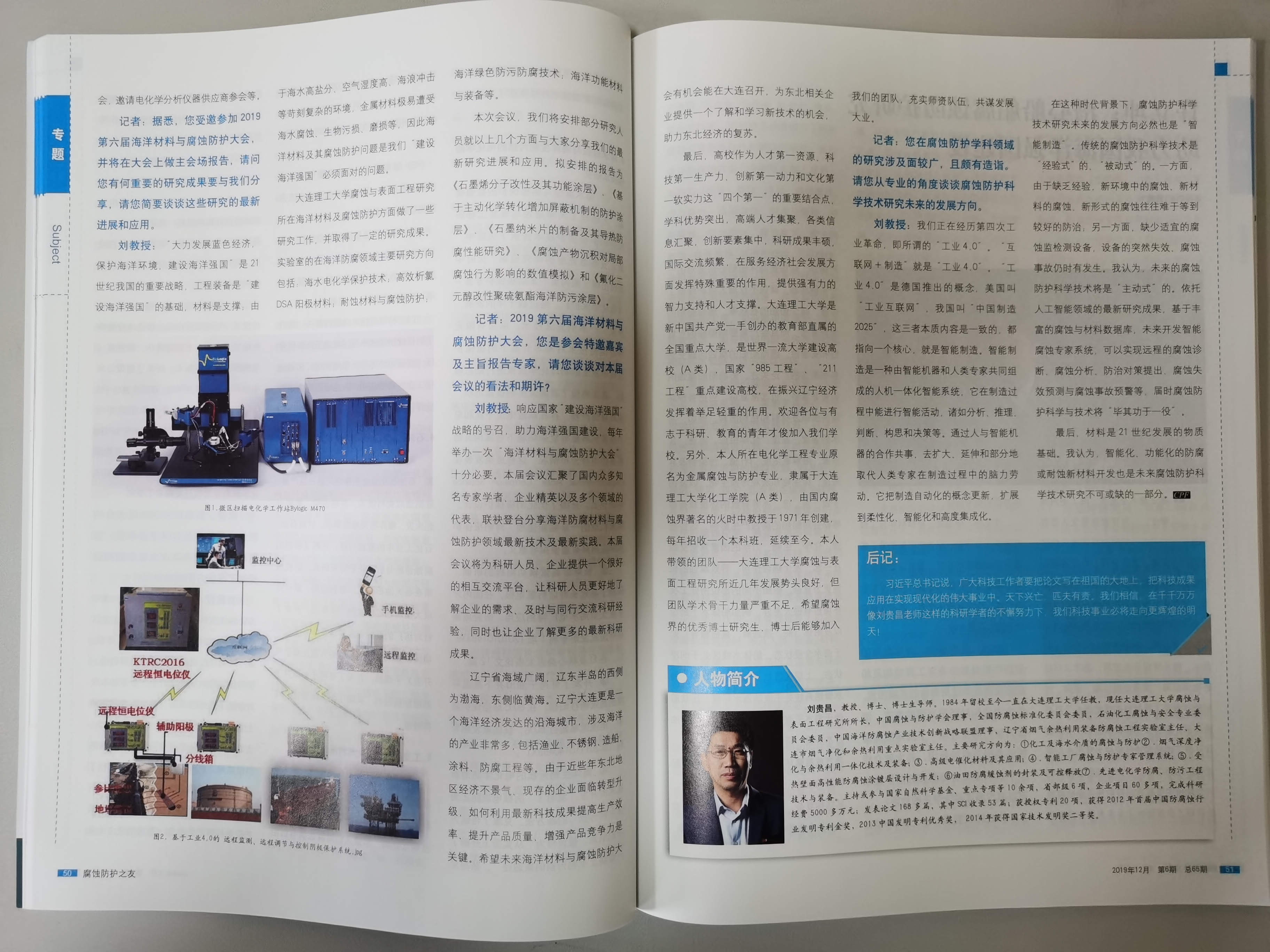 《腐蝕防護之友》是中國腐蝕與防護學會主辦的腐蝕領域高水準雜志,也是各屆腐蝕防護大會的官方媒體。2019年12期雜志中報道了此次盛會,并專題報道了大連理工大學劉貴昌教授,其中大篇幅介紹了劉貴昌教授課題組的Bio-Logic掃描電化學工作站M470。目前劉貴昌教授課題組采用M470做腐蝕研究,已經在很多一區(qū)、二區(qū)SCI雜志(Corrosion Science、Electrochimica Acta等)上發(fā)表了多篇高水平的文章。掃描電化學工作站M470作為腐蝕和電化學領域的高精尖設備,是您做腐蝕研究的不二選擇!