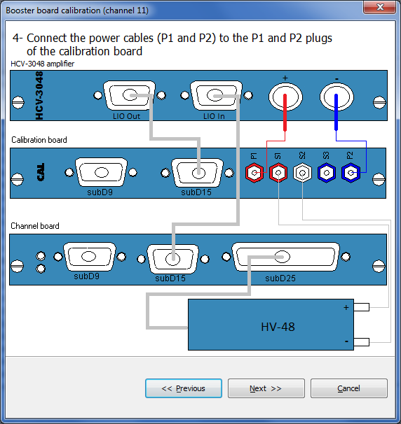 9. Booster板和HCV-3048校準(zhǔn)接線(xiàn)方式不同,根據(jù)對(duì)話(huà)框提示,一步一步連接相應(yīng)的接線(xiàn)即可。