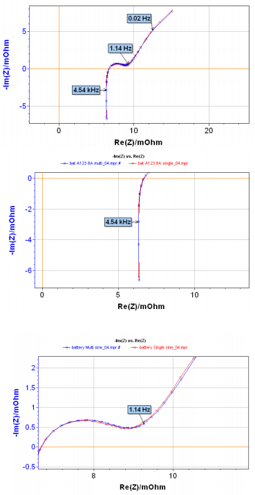 Figure.2 鋰離子電池single sine及multisine eis測量模式對比,紅線為single sine數(shù)據(jù)曲線,藍(lán)線為multisine數(shù)據(jù)曲線。