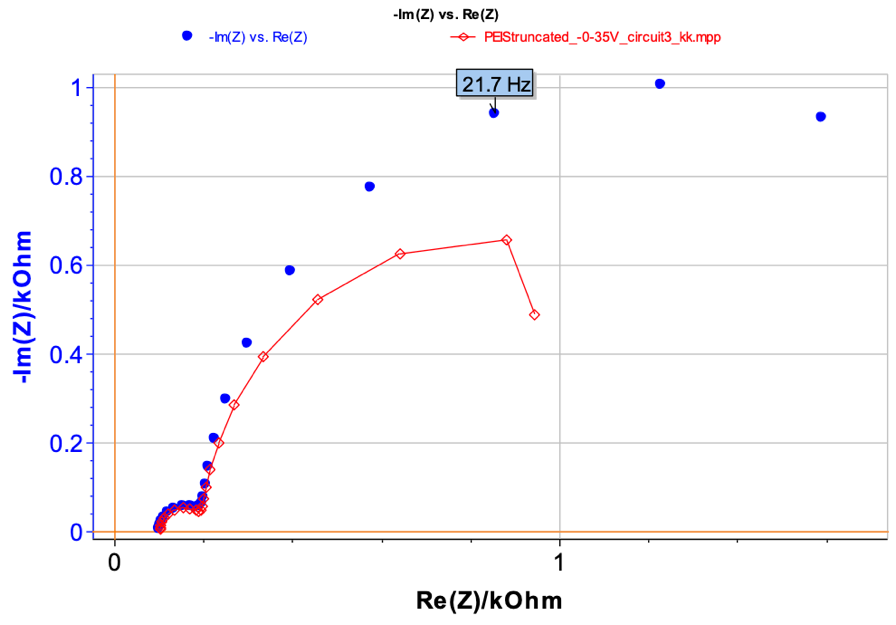 圖4: 有限范圍頻率值下的截斷阻抗圖(EWE = -0.35 V, Va = 10 mV, fmin = 10 Hz, fmax = 50 kHz(藍線))以及K-K轉換獲得的Nyquist圖(紅線)