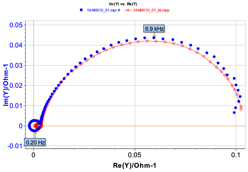 圖11: 使用PEIS技術在H2SO4介質中獲得的鎳電極Nyquist圖(EWE = 0.9 V, Va = 12.5 mV, fmin = 50 mHz, fmax = 10 kHz(藍線))以及K-K轉換獲得的Nyquist圖(紅線)