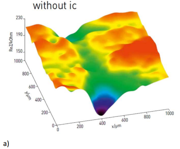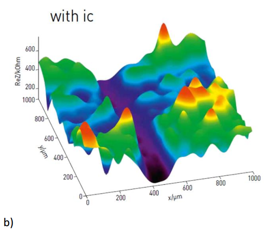 ac-SECM允許用戶不使用氧化還原介質進行SECM測試,研究表面局部電導率。請參見Bio-Logic網站的教程,獲得更多信息。盡管如此,ac-SECM也存在與SECM一樣的缺點,都會受表面形貌的影響。采用ic-SECM可以避免此缺陷,如圖9所示。