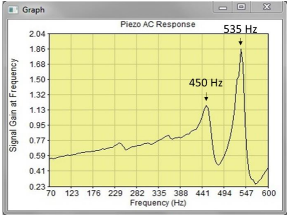 第一步,描述壓電的交流響應,當連接電纜后,探針安裝在固定器上,浸入溶液。交流描述的目的是找到壓電+探針固定器+探針+電纜集合的諧振頻率。圖2是典型的交流響應。