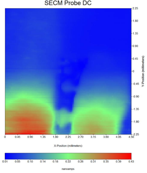 本文介紹了ic-SECM在腐蝕研究領域的優(yōu)勢。焊接鋼樣品實驗中,ic-SECM的優(yōu)勢是進行較大區(qū)域的掃描(實驗中為20mm2),而沒發(fā)生探針與樣品的碰撞。Al樣品實驗中,ic-SECM的優(yōu)勢是更清楚的表征樣品表面的反應差異,而排除形貌的影響。兩個案例中,由于探針非常接近樣品,探針尖端的信號增強。