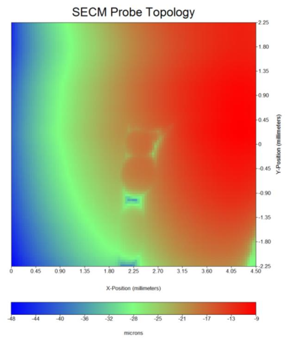 電化學活性測量的同時,也測量了表面形貌,如圖6所示。顯示的數值是探針高度,因此紅色區(qū)域高于藍色區(qū)域。表面形貌變化約40?m。同樣也可以看到兩個焊接件和絕緣部分。