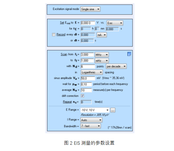 為了在R/C或R+C中選擇合適的等效電路,需要在較寬的頻率范圍(即3 MHz至1 mHz)上進(jìn)行EIS測(cè)量。設(shè)置如圖2所示。