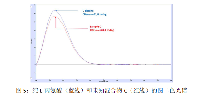 樣品C的最大圓二色光譜信號為28.1 mdeg。該圓二色光譜對應(yīng)于94.2%的L-丙氨酸和5.8%的D-丙氨酸的混合物。