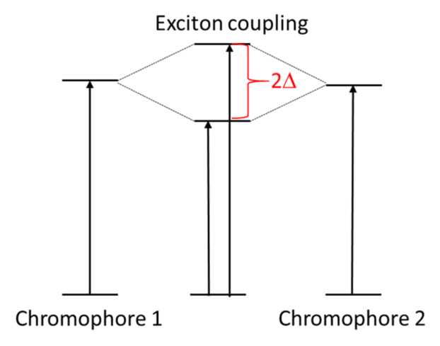 激子耦合圓二色發(fā)生于大分子兩個手性生色團(tuán)之間。當(dāng)兩個生色團(tuán)位置合適(距離短、角度合適、環(huán)境合適等),它們互相電子轉(zhuǎn)移產(chǎn)生兩個不同的CD帶,如圖1所示。激子耦合圓二色靈敏度和識別度高,它與給定的空間結(jié)構(gòu)相關(guān),可以獲得復(fù)雜結(jié)構(gòu)的絕對構(gòu)型信息。激子耦合圓二色經(jīng)常用在高分子、手性有機凝膠和其他手性大分子的可見光區(qū),也可用于蛋白的近紫外區(qū),是傳統(tǒng)遠(yuǎn)紫外圓二色譜的補充。